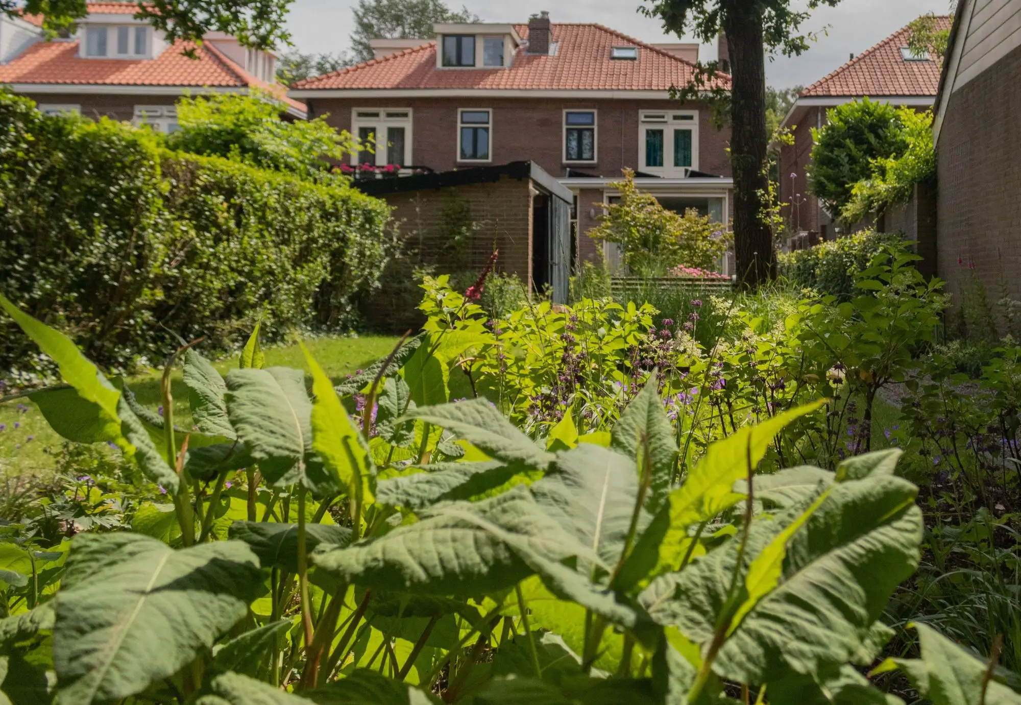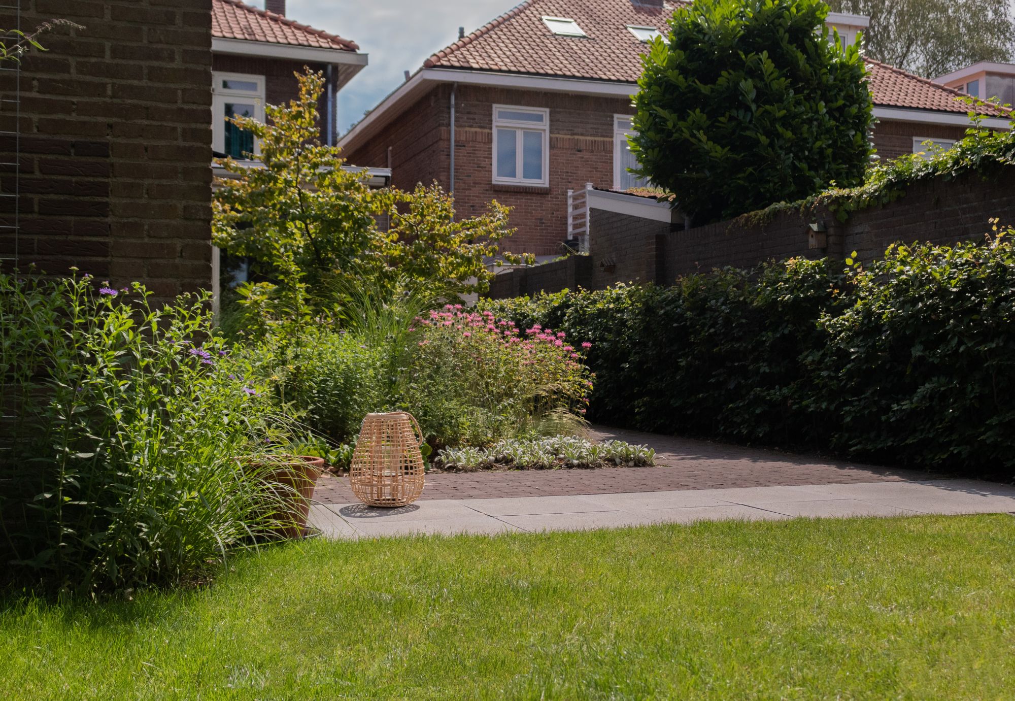 De eigenaren van deze groene stadstuin dichtbij het centrum van Nijmegen hadden de wens om een groene achtertuin te realiseren. Waarin de eikenboom behouden bleef en zo veel mogelijk groen te vinden is. Waar vogels en andere dieren kunnen leven en de biodiversiteit hoog is. Vandaar dat er zo min mogelijk gebruik gemaakt is van bestrating. In de bestrating zijn verschillende materialen gebruikt; gebakken klinkers, gecombineerd met split halfverharding. In de voortuin is de bestrating onderbroken door een mooie grote meerstammige heester. De voor- en achtertuin hebben verschillende borders met veel kleur en waarin verschillende seizoenen terug zijn te zien. Om een groene wand te creëren is er zowel in de voortuin als in de achtertuin gebruikt gemaakt van beukenhagen. Dat privacy biedt en woonruimte voor de vogels.