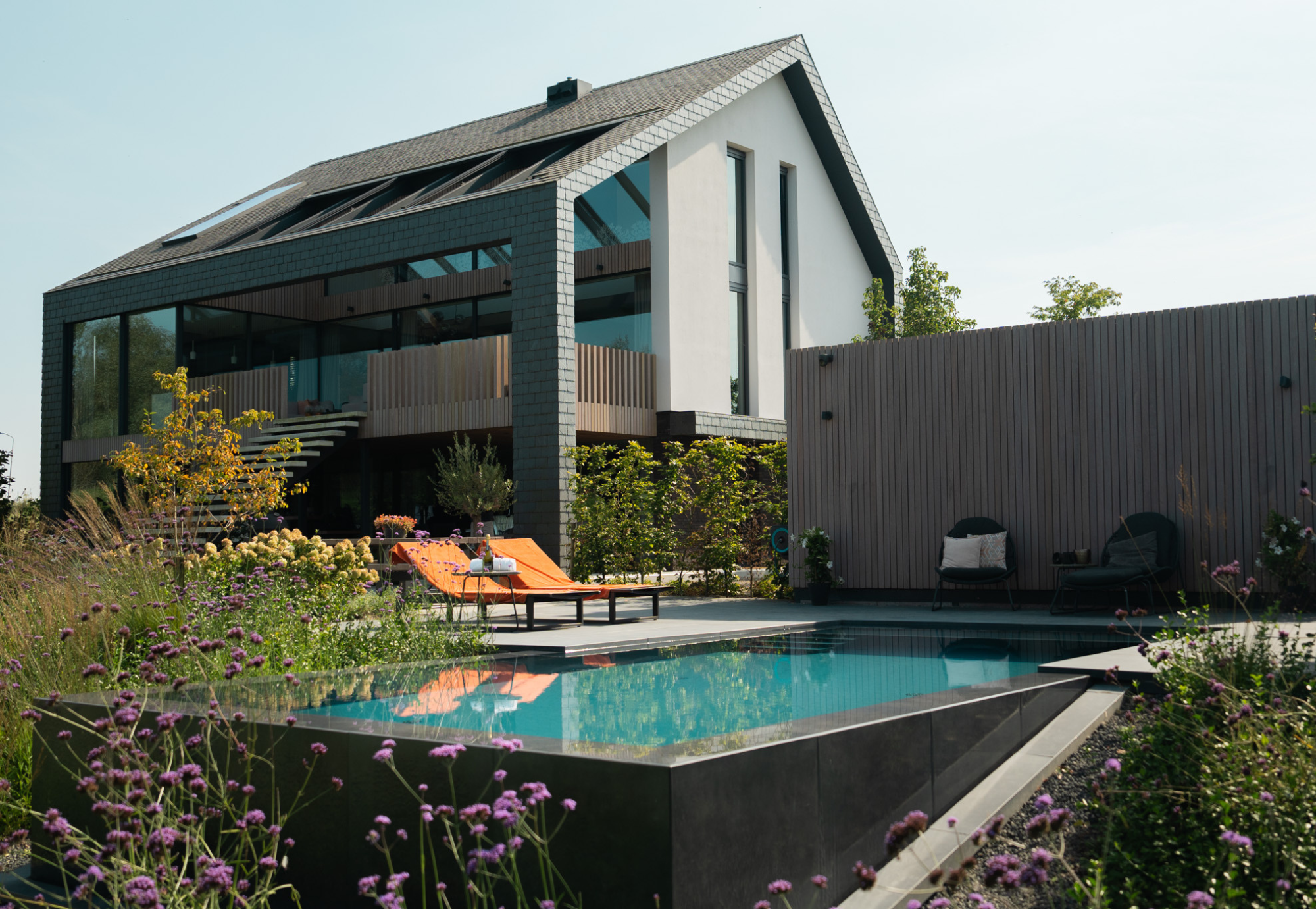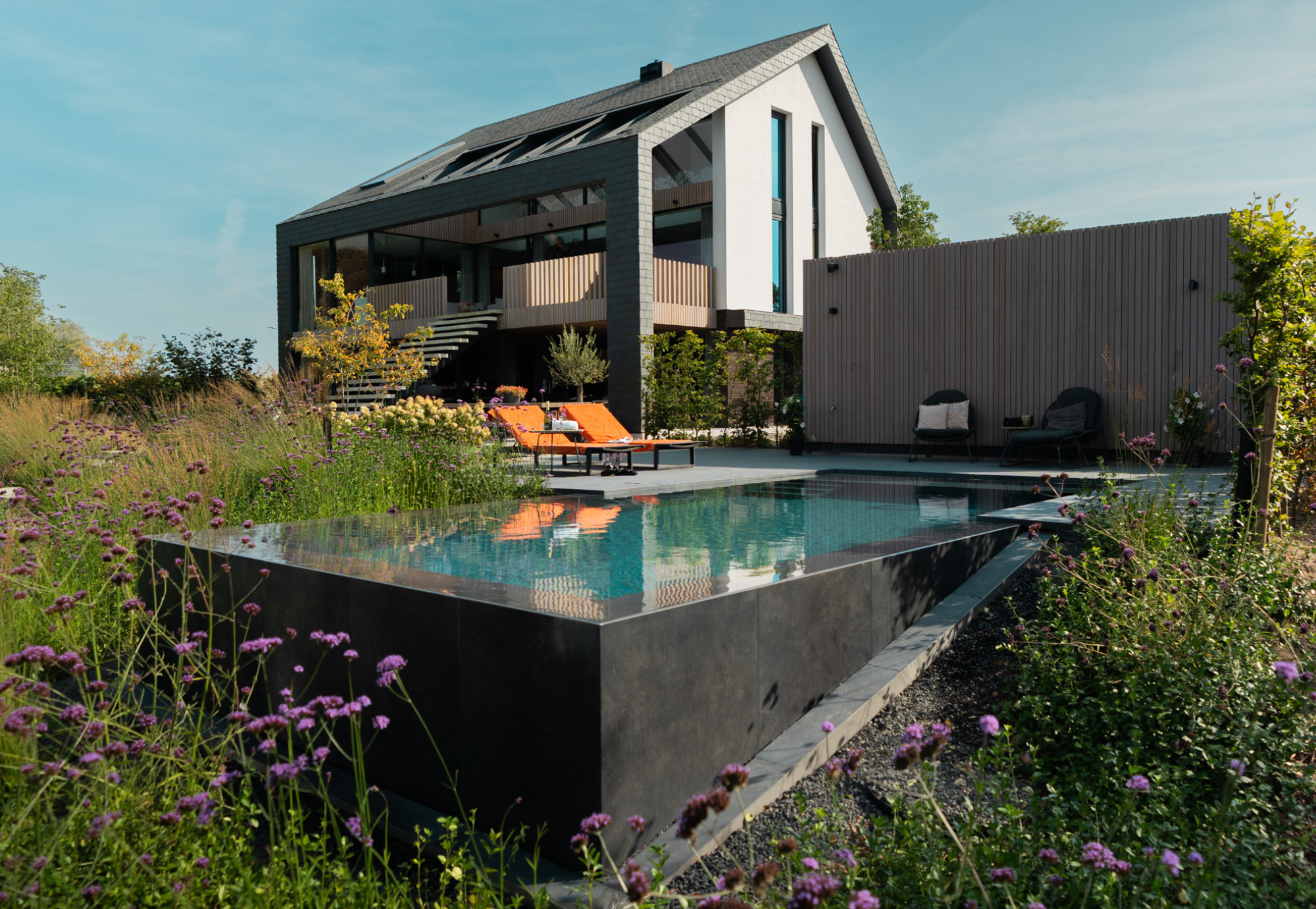 Een bijzonder element binnen deze landschapstuin in Wamel is het zwembad, dat later in het ontwerpproces is toegevoegd. In samenwerking met Helder Zwembaden is het zwembad zorgvuldig ingepast in het geheel. Daarbij is er nadrukkelijk op gelet dat dit luxe element geen afbreuk doet aan de landschappelijke beleving. Integendeel. Het zwembad versterkt juist de ervaring, doordat de bewoners vanuit het water kunnen genieten van het weidse uitzicht over de Waal en de omliggende natuur.