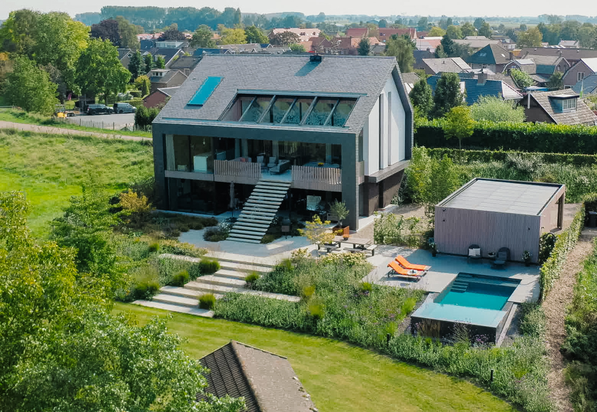 Voor een designwoning aan de Waalse dijk in Wamel heeft Uw Tuin hoveniers zowel het tuinontwerp als de complete tuinaanleg verzorgd. Het resultaat is een unieke landschapstuin met een open karakter en een sterke verbinding met het omliggende rivierenlandschap. Vanuit de woning leidt een architectonische trap de tuin in, richting het lager gelegen weiland. In combinatie met een ruim terras en een stijlvol geïntegreerd zwembad ontstaat een plek waar wonen, natuur en uitzicht naadloos in elkaar overlopen.
