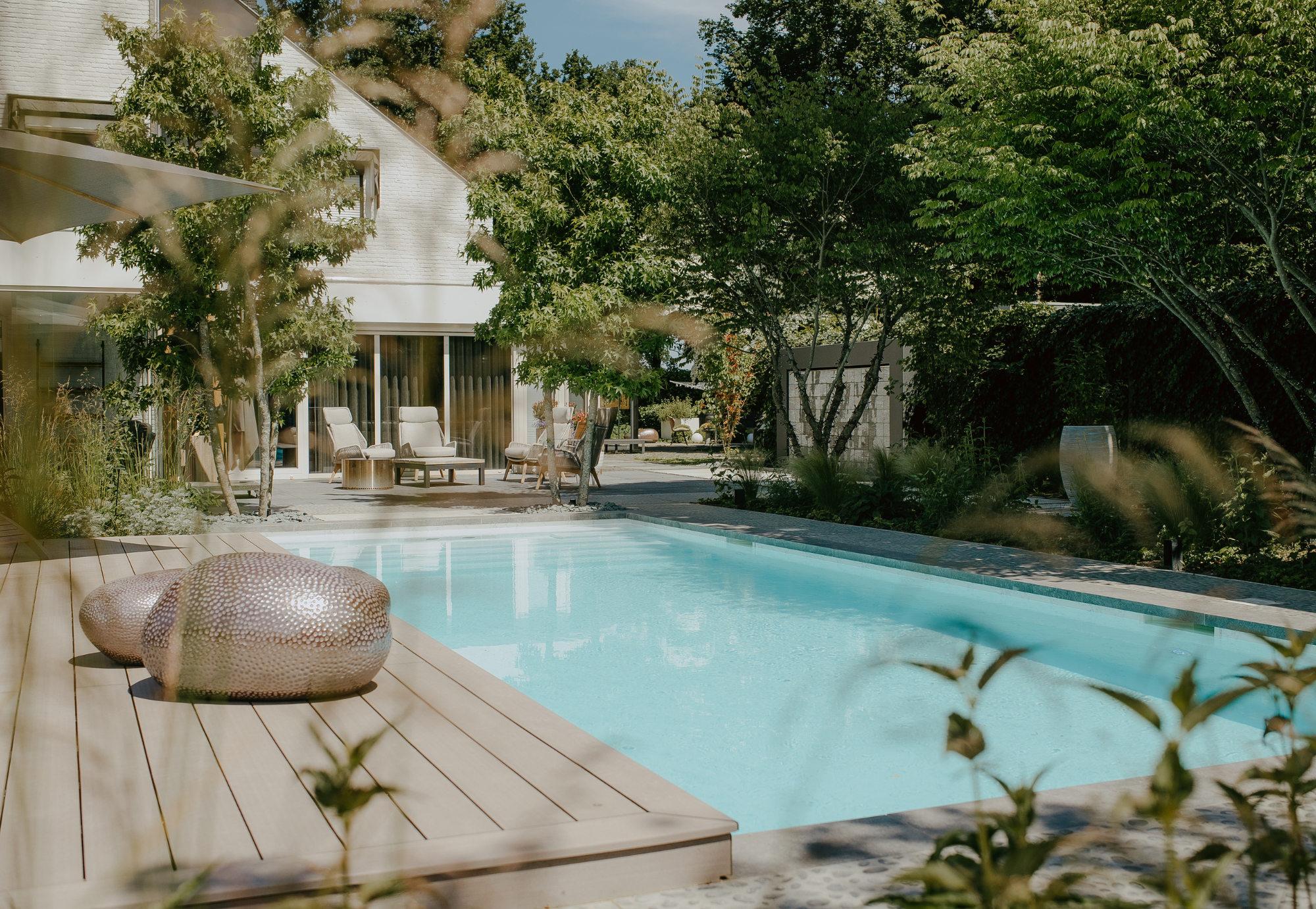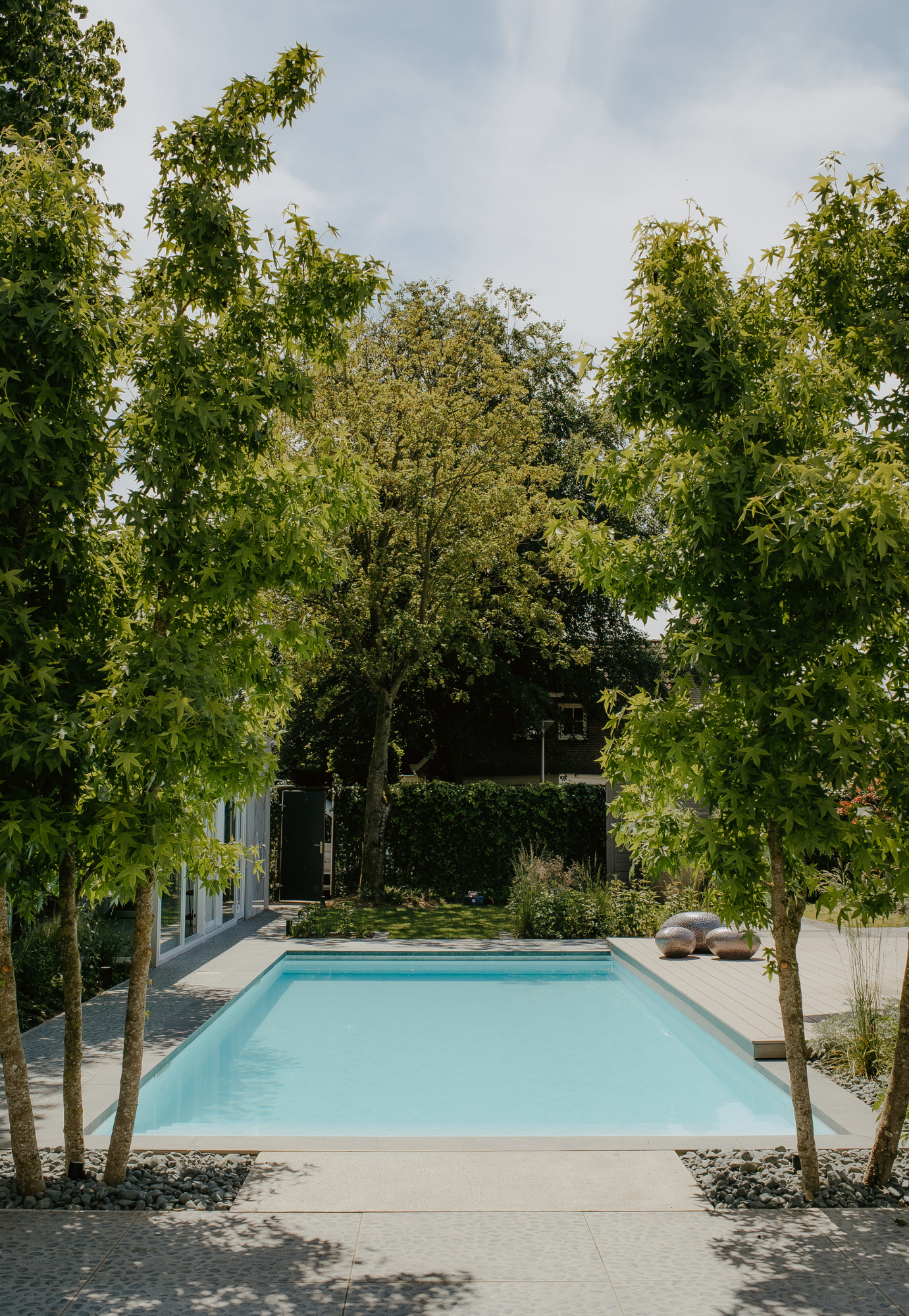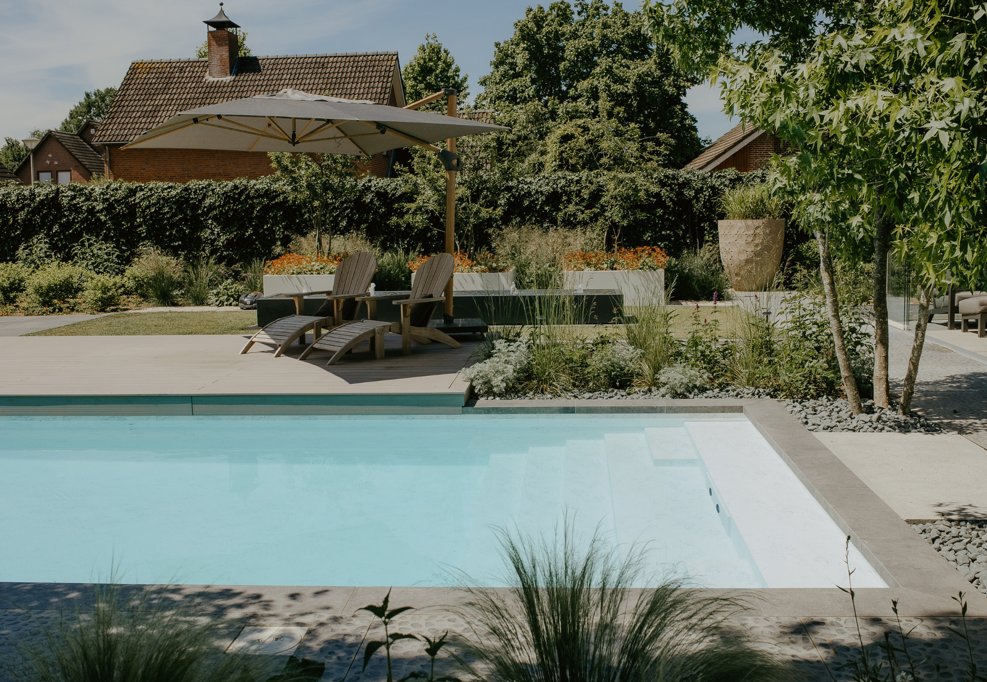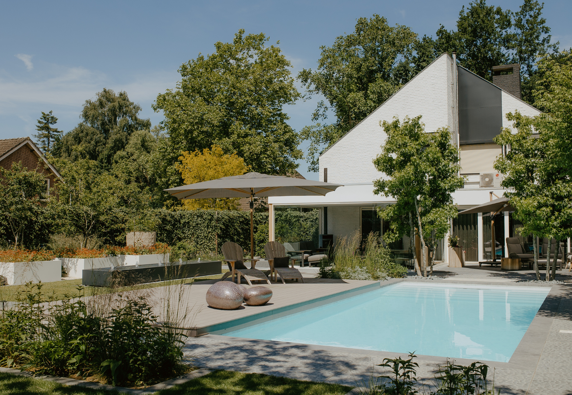 Het op maat gemaakte zwembad, gerealiseerd met Helder Zwembaden, vormt het stralende middelpunt van de tuin. Samen met het poolhouse biedt het een comfortabele en sfeervolle plek om zomerse avonden te beleven, te ontspannen met familie en vrienden en optimaal te genieten van het buitenleven.