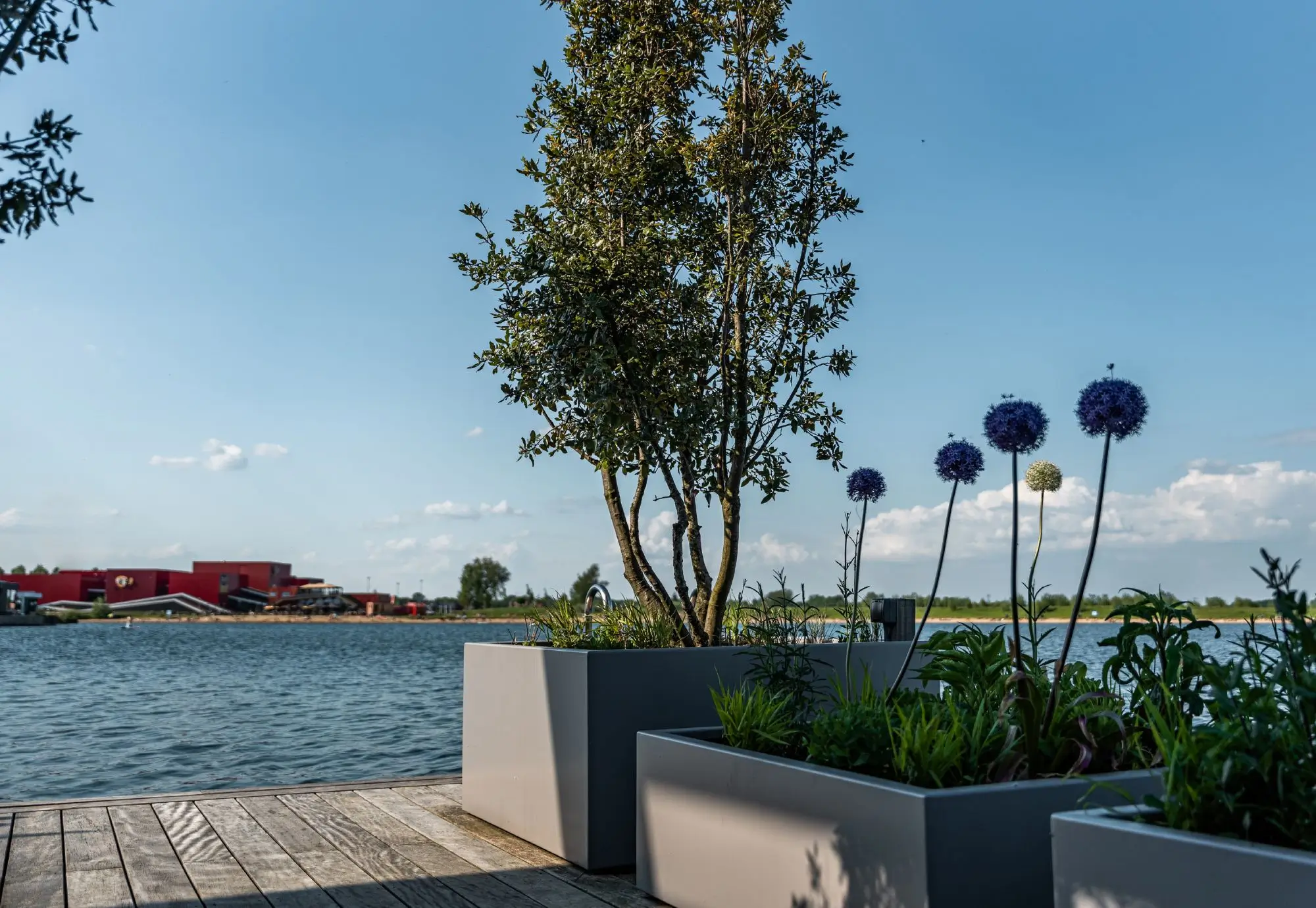 Deze unieke drijvende woning op de Lentse plas hebben wij aan mogen kleden met groen door het plaatsen van moderne bakken en wintergroene bomen. Welke passend zijn bij de kubistische architectuur van de woning. Er is gekozen voor kleurrijke beplanting om het terras levendiger te maken. Door deze toevoegingen genieten de bewoners dagelijks van het mooie uitzicht dat ze hebben. Het was een uniek project! Alleen al door de manier waarop de bakken en bomen op het terras terecht zijn gekomen. Â
